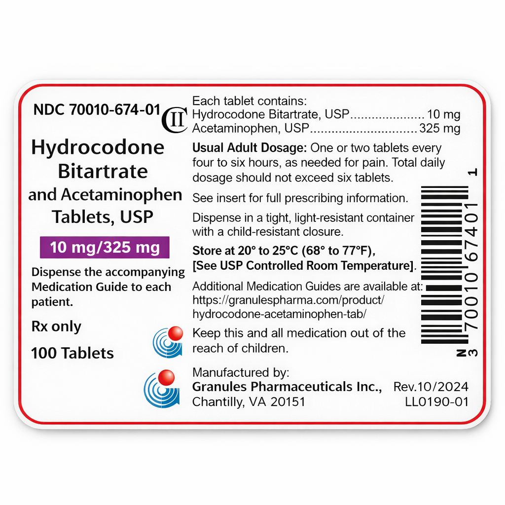 Hydrocodone 10-325 mg is a combination analgesic containing 10 mg of hydrocodone and 325 mg of acetaminophen. Hydrocodone works by changing how the brain and nervous system respond to pain, while acetaminophen supports and strengthens pain relief. This medication is commonly prescribed for short-term pain management and should be used only under medical supervision due to its opioid content.