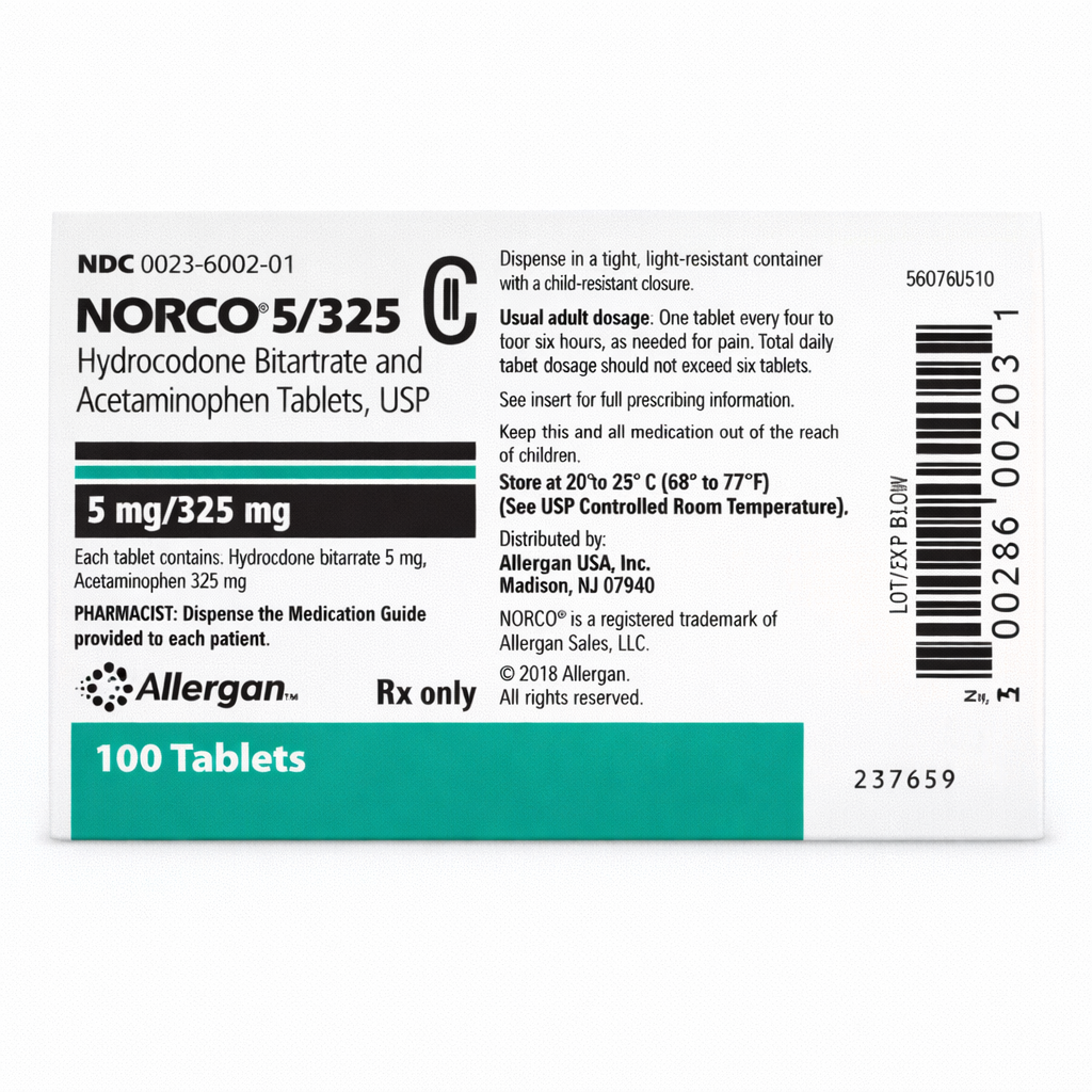 Norco 5-325 mg is a combination analgesic containing 5 mg of hydrocodone and 325 mg of acetaminophen. Hydrocodone works on the central nervous system to lower the feeling of pain, while acetaminophen enhances pain relief. This lower-strength dose is usually prescribed for patients who need controlled pain relief without stronger opioid exposure. Norco 5-325 mg is intended for short-term use and should only be taken according to a doctor’s instructions.